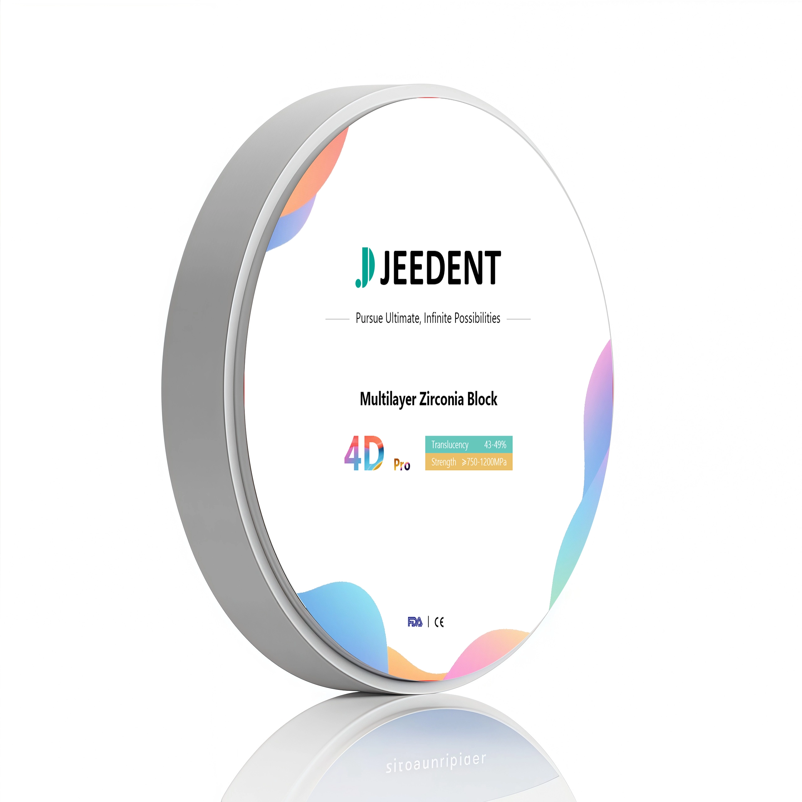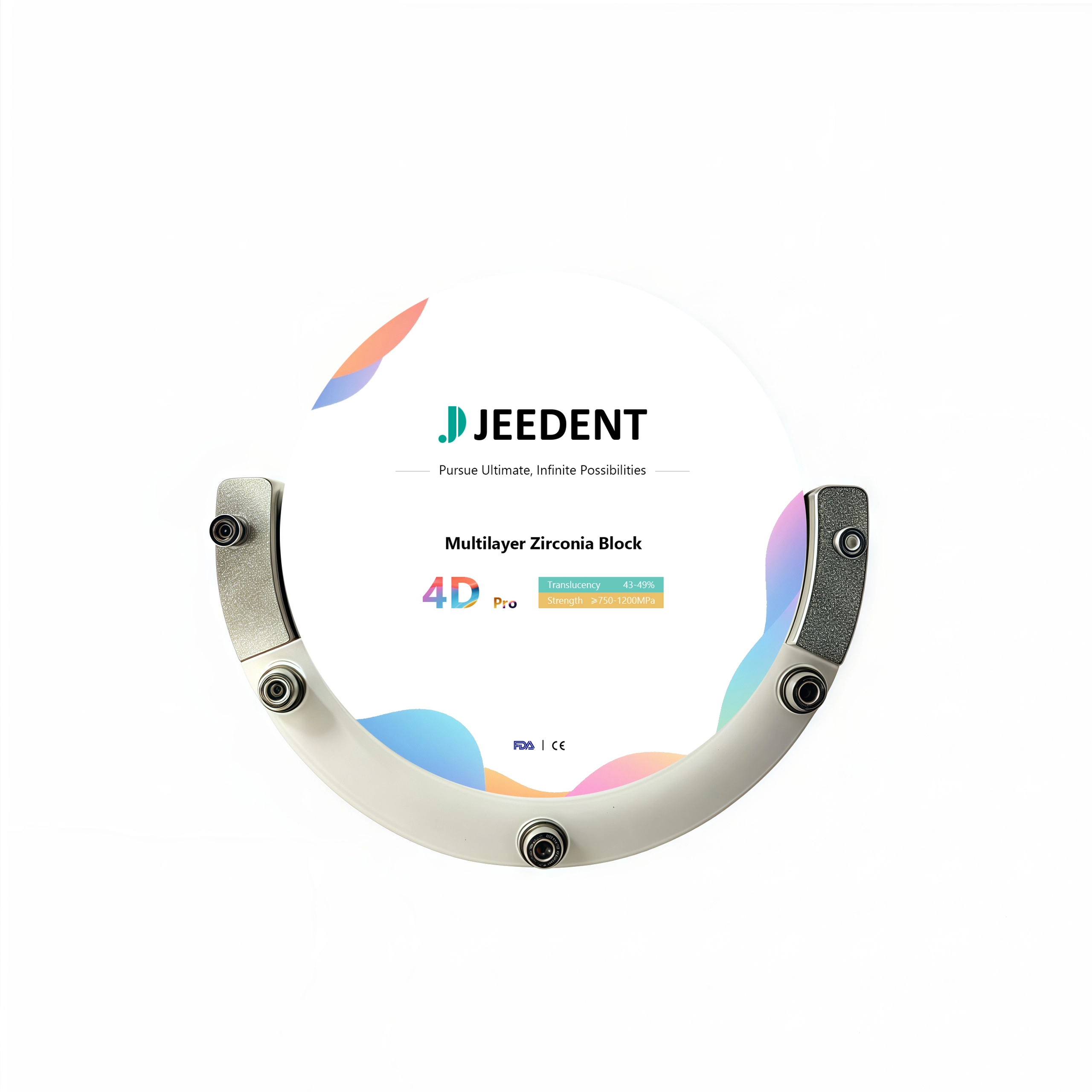 4D PRO Zirconia adopts advanced 8-layer gradient technology, combining natural aesthetics and excellent performance with seamless transitions across multiple dimensions. It features a flexural strength of 750-1200 MPa and a translucency of 43%-49%.