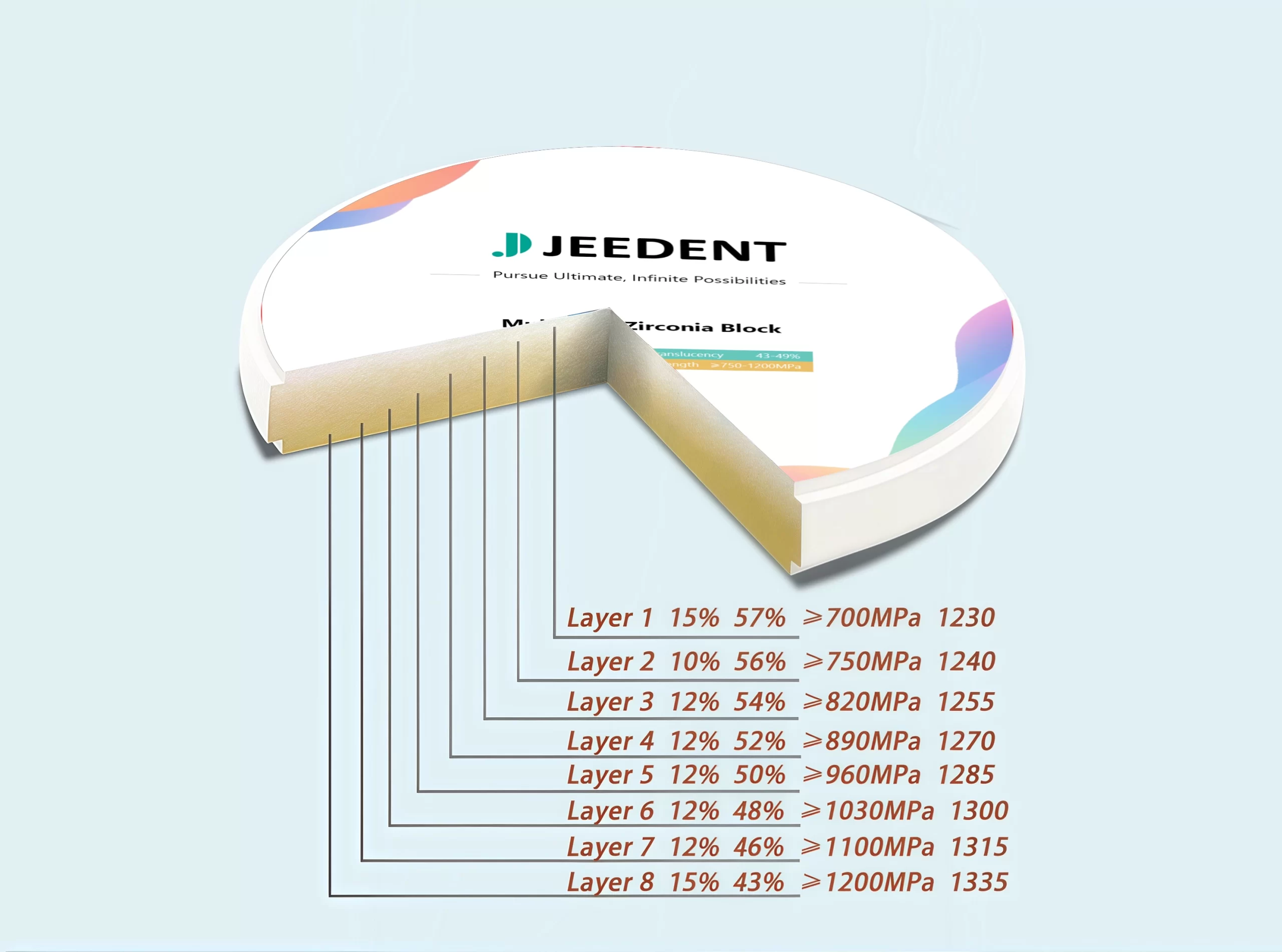Strength ≥750-1200MPaTranslucency 43%-49%Vickers Hardness